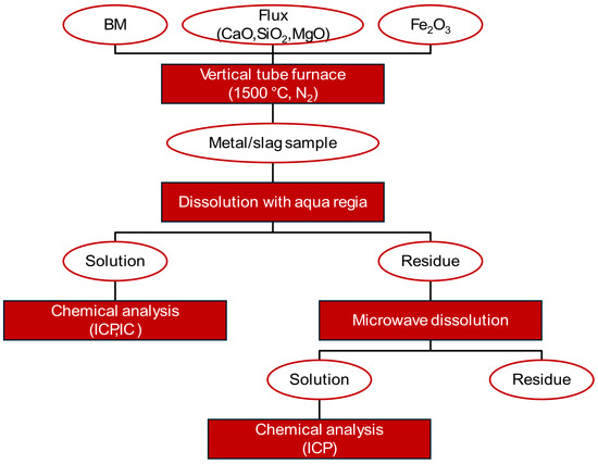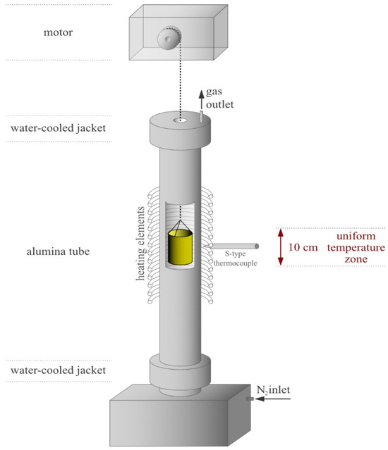 Individual isothermal trials were conducted at 1500 °C in a vertical tube furnace (Figure 2) in a gas-tight mode in order to, in each experiment, produce a sample weighing approximately 20 g. Nitrogen gas (N2, >99.996%) was supplied at a flow rate of 2 L/min to maintain an inert atmosphere and also to effectively remove the reaction gas products from the sample surface. An S-type thermocouple mounted in the furnace was used to monitor the temperature in the uniform temperature zone. The uniform temperature zone was verified using an external thermocouple. The sample was put in an MgO cylindrical crucible, which was initially positioned in the upper part of the furnace at approximately 700 °C for 15 min to preheat the crucible and prevent thermal shock. Subsequently, the crucible was transferred to the uniform temperature zone of the furnace, set at 1500 °C, where it was maintained for 1 h. Following this trial, the sample was raised, taken out of the furnace, and cooled with an N2 torch to minimize oxidation. After cooling, the sample was weighed. Attempts were made to separate the slag and metallic phases for chemical analysis. However, in most cases, complete separation was not possible, and a mixture of slag and metal was prepared for the chemical analysis.