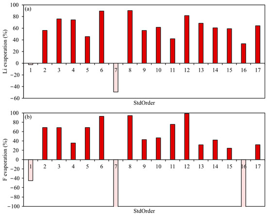 The Li and F evaporations are presented in Figure 4. Data from three experiments (StdOrders 1, 7, and 16) were found to be inconsistent with the rest. In StdOrders 1 and 7, both Li and F evaporations were negative. In StdOrder 16, while F evaporation was negative, the Li evaporation was positive; however, this result appeared unreliable, as it did not align with the two other center points (StdOrders 15 and 17). Consequently, these three observations were excluded from the subsequent statistical modeling. The authors suspect that the inaccuracies may have originated from the sampling process.
