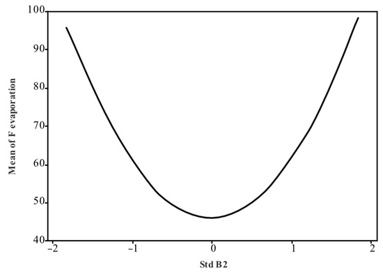 The model evaluation indicators were 54.04% for R2, 45.69% for adjusted R2, and 4.39% for predicted R2. These values, similar to the values from the Li evaporation model, highlight that additional factors are required to be included for a more comprehensive model. The low predicted R2 shows the model’s limitation in predicting the unseen data. Complete details of the regression model are provided in File S2. The factorial plot for F evaporation (Figure 6) shows high evaporation at low and high B2 values, with lower evaporation at midrange B2 values.