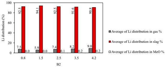 Li distribution in gas, slag, and MeO phases, calculated using FactSage, with changing B2 (Std deviation lower than 1.5).