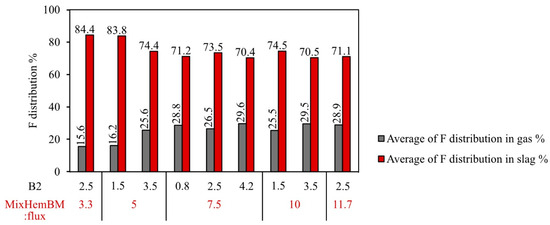 F distribution in gas and slag phases, calculated using FactSage, with changing B2 and MixHemBM:flux (Std deviation lower than 0.9).