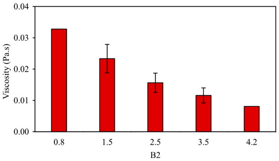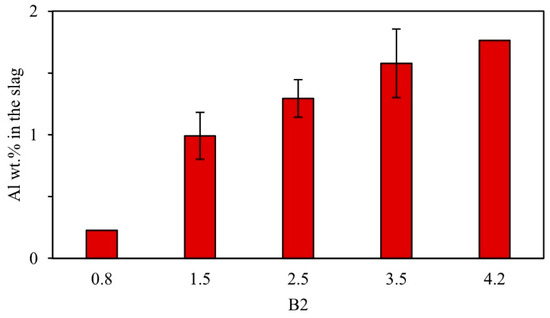 To investigate this, the viscosity of the slags was modeled using FactSage, with the results presented in Figure 9. The modeling shows a decrease in viscosity with increasing B2 content. To understand this effect further, the relationship between the initial B2 content and the final slag composition was analyzed using FactSage, revealing that higher initially set B2 values are associated with an increase in the Al content of the final slag (see Figure 10).