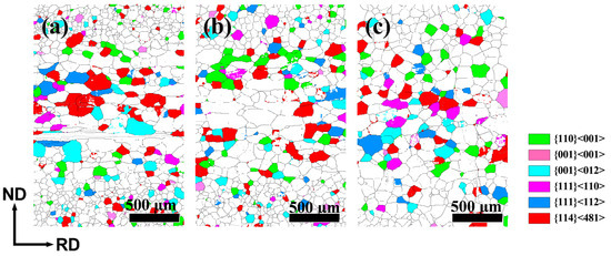 Due to the difference in the storage energy of grains with different orientations in the normalized plate, the order of the deformation storage energy of grains with different orientations is E{110} <100> < E{001} <110> < E{112} <110> < E{111} <112> < E{111} <110>. The {001} <110>- and {001} <100>-oriented grains with lower storage energy in the initial stage of recrystallization are difficult to recrystallize. The {111} <112>-oriented grains have high storage energy, high mobility, and a high growth rate. The new {111} <112>-oriented grains nucleate inside the {111} <112> deformed grains and on the grain boundaries of the {001} <110> deformed grains. The storage energy of {111} <112>-oriented grains in the core deformation zone of the hot-rolled plate is high, and finally more {111} <112> recrystallization texture is formed in the core. The {114} <148>-oriented grains nucleate in the α deformation band and grain boundaries, resulting in a large area fraction of {114} <148> texture in the central layer [23,24,25]. The study of Xu et al. also proved that with the increase in normalizing temperature, α*-fiber grains had growth advantages, resulting in strong α*-fiber textures. The nucleation of α*-fiber grains was related to the α-fiber deformed matrix grains. However, the lower normalizing temperature in this study is 900 °C, and the longer normalizing time is 10 min, which is not well referenced by the actual process parameters in the industrial field [26].