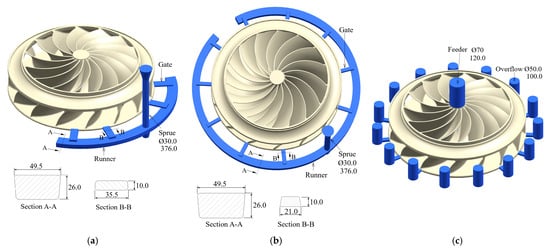 Three types of gating systems for the backward-curved fan: (a) bottom-up with four gates; (b) bottom-up with ten gates; (c) top-down (unit: mm).