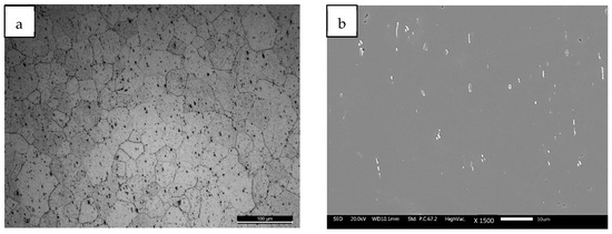Cylindrical samples (diameter 4.5 mm, height 9 mm) were cut from a commercial extruded bar made of a AA6060 T6 alloy with a hardness of 93 HV1. The microstructure of the alloy investigated by light optical microscopy and scanning electron microscopy (SEM) is shown in Figure 1a (at LOM) and Figure 1b (at SEM). The sample contains a consistent amount of precipitates with a size of 1–8 µm. According to literature data, the Fe– and Si– containing precipitates typically formed in this alloy are rounded α–AlFeSi and plate–like β–AlFeSi intermetallics [28,29].