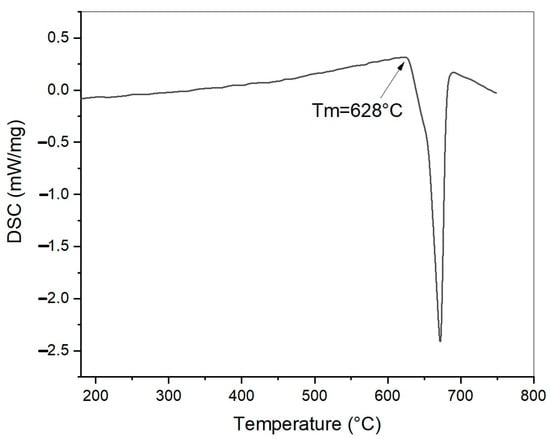 The melting point of the alloy was detected through differential scanning calorimetry, and it is 628 °C. The DSC (differential scanning calorimetry–STA 409 Luxx Netzsch, (Netzsch Gmbh, Selb, Germany) curve showing the melting peak is reported in Figure 2.
