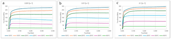Hot compression curves at different temperatures and (a) = 0.001 s−1, (b) = 0.01 s−1, and (c) 0.001 s−1.