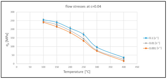 The flow stresses σ corresponding to a deformation of ε = 0.04 (indicated with σ0.04) were taken as a reference to compare the strength of the alloy at different temperatures and strain rates. When the steady–state conditions are not reached, the flow stress can be replaced by an «apparent» flow stress. This is particularly useful when it is necessary to reliably determine the ‘flow stress’ in the initial stages of the plastic deformation process, before steady–state is achieved [15,19,26,30]. These stress values derived from the curves of Figure 3 are reported in Figure 4. The highest value of stress at ε = 0.04 is 255 MPa, measured after hot compression at the lowest temperature (100 °C) and the maximum strain rate (0.1 s−1), while the minimum stress (16 MPa) was found at 400 °C and a low strain rate (0.001 s−1). Compression tests on the same alloy were carried out at higher temperatures and strain rates by Qian et al. (520 °C–610 °C—1 s−1) in as–cast and homogenized conditions, finding peak flow stress values between 27 and 30 MPa [5].