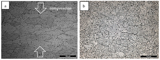 The microstructure of the 6060 alloy after plastic deformation at the lowest temperature of 100 °C and at a strain rate of 0.001 s−1 is shown in Figure 5a. The grains appear elongated in the direction perpendicular to the compression deformation, which is indicated on the micrograph. After deformation at the highest temperature of 400 °C (Figure 5b), equiassic grains larger than those of the initial sample are visible, indicating that dynamic recrystallization (DRX) and grain growth occurred, while they did not take place at 100 °C. This behavior is rather general. For temperatures below 200 °C, the grains appear flattened at the end of the deformation process, while at temperatures higher than 250 °C, they are not. Considering the increase in flow stress with the applied strain (Figure 3), it can be concluded that the material underwent strain hardening during the plastic deformation process under these conditions. Above 250 °C, DRX occurred, as indicated by the shape of the stress–strain–curve, which is characterized by a stress decrease after a maximum point.