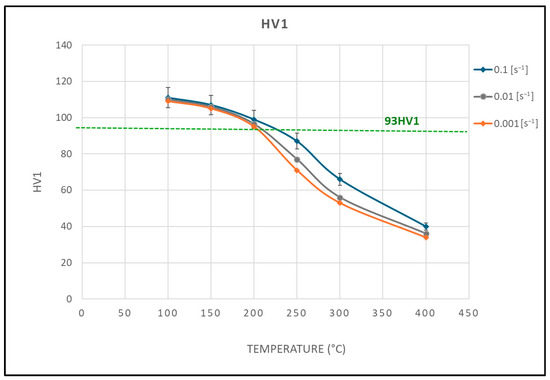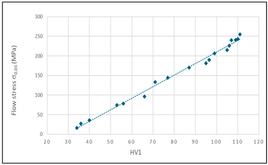 Plotting the flow stress, σ0.04, as a function of the hardness, a very good linear correlation is found, as shown in Figure 7. This confirms that the flow stress is representative of the alloy plastic strength, as influenced by temperature and strain rate.
