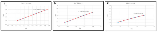 log(σ) vs. log(ε) curve used to calculate the strain hardening exponent n, as a slope of this line, according to the Hollomon equation (Equation (2)) at (a) 100 °C—0.1 s−1, (b) 150 °C—0.1 s−1, and (c) 200°C—0.1 s−1.