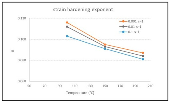 The obtained n values are summarized in Table 1 and reported as a function of temperature in Figure 9. As can be observed, the strain hardening exponent decreases, increasing temperature and decreasing the strain rate. In fact, when the strain rate is lower, the dislocations have more time to move and multiply, leading to higher work hardening. A similar behavior was observed also for a 7075 Al alloy [31]. The values of n found in the literature for the 6060 Al alloy at room temperature are in the range of 0.11–0.15 [32,33]. At temperatures higher than 200 °C, the alloy undergoes dynamic recrystallization; therefore, it does not show strain hardening.