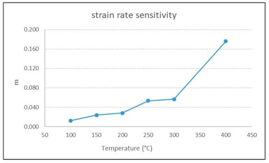 Strain rate sensitivity m was calculated according to Formula (3) considering the flow stresses at ε = 0.04 (σ1 and σ2) on the curves at the lowest and the maximum strain rates (έ1 = 0.001 s−1 and έ2 = 0.1 s−1). The obtained values of m are reported in Table 2 and plotted in Figure 10. A consistent increase in m is observed from 300 °C. These values are in line with those found by Vilamosa et al. in the same temperature range (RT–400 °C) [3] and Verlinden in the temperature range of 390–520 °C [4]. For temperatures lower than 250 °C (i.e., homologous temperature lower than ~0.55), m is lower than 0.05, while it exponentially increases up to ~0.18 for a homologous temperature greater than 0.55, typical of hot deformation conditions. Similar values were also found in the same temperature range for different Al alloys, for example, by Navid Moghadam [34] on an Al–Mg–Si alloy and by Cavaliere on an Al–Cu–Mg alloy [35].
