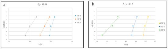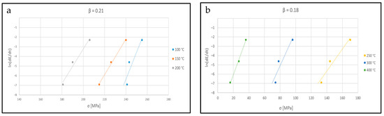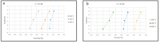 In order to obtain n, this part of the σ–ε curves has been reported in a log scale, and the slope of the obtained linear correlation was measured, as shown in Figure 8a–c, for the sample deformed at 100 °C, 150 °C, and 200° C—0.1 s−1. Linear correlation between log(σ) and log(ε) was found only for the compression curves at 100 °C–150 °C and 200 °C.