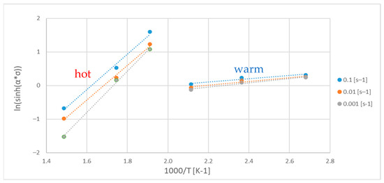The constant n is calculated as the mean slope of the correlations ln vs. ln(sinh(ασ)) (Figure 13), and it is n = 40.20 for the warm temperature range and n = 9.04 for the hot temperature range. Since the activation energy can be expressed as Q = nRs, where s is the slope of ln(sinh(ασ)) vs. 1000/T (Figure 14) and R is the gas constant, the value of the activation energy could be calculated. As can clearly be observed in Figure 14, the points plotted can be divided into two sets (corresponding to two temperature ranges), which are fitted by lines with different slopes. The warm range has a lower slope with respect to the hot one, and consequently the Q value derived is much lower, as can be seen in Table 3, which summarizes all the constant values found by applying Equation (1) to the warm and hot regime of the temperatures.