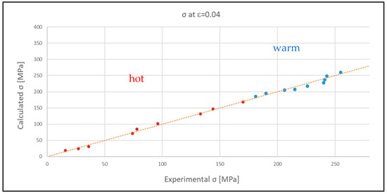 The data of σ calculated by applying the model at the warm and hot temperature ranges were correlated with the experimental ones and, as can be observed in Figure 15, a very good correlation was obtained.