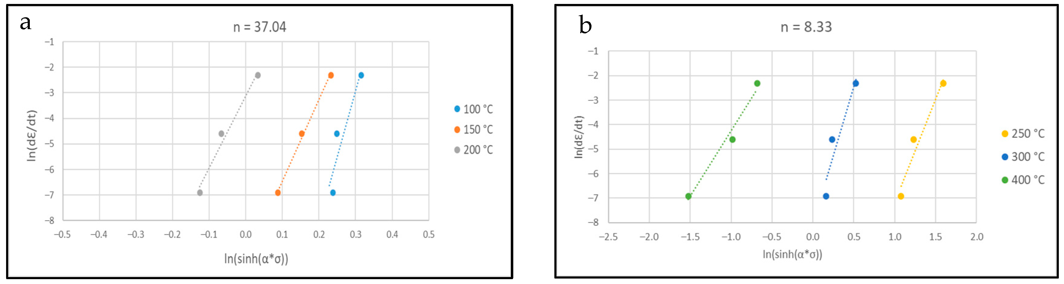 ln vs. ln(sinh(ασ)) used for the determination of n for warm (a) and hot regimes (b).