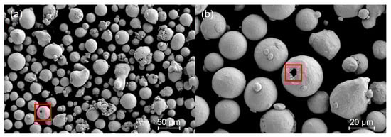 For the feedstock material, a gas-atomized virgin tool steel powder of X3NiCoMoTi18-9-5 (1.2709) (m4p material solution GmbH, Magdeburg, Germany) was used. The morphology was analyzed with a scanning electron microscope (SEM). The Gemini 2 system (Carl Zeiss GmbH, Oberkochen, Germany) was used for this purpose, using SE2 contrast at 5 kV. Figure 1 shows the powder under 250× and 750× magnification.