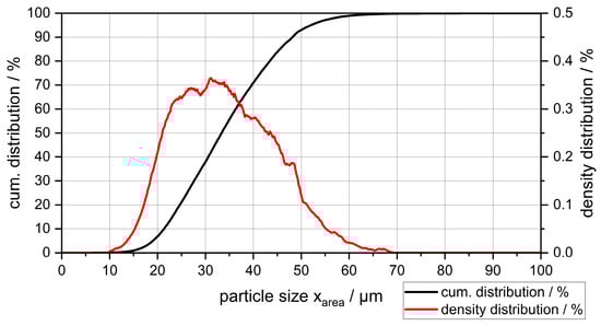 The powder contains predominantly spherical particles, some of which have satellite-like adhesions. In contrast to the spherical particles, there are also irregular-shaped particles that likely resulted from the collision of several particles during the atomization. Furthermore, hollow particles could be identified due to the open pores on the surface (marked in red). The particle size distribution was measured according to the principle of dynamic image analysis using a Camsizer X2 (Microtrac Retsch GmbH, Haan, Germany). The dispersion pressure for this measurement was set to 150 kPa and the used nozzle measured 4 mm in diameter. Figure 2 shows the cumulative function and density distribution plotted against particle size. For the definition of particle size, parameter x_area was used, which indicates the size of the particle as the diameter of a circle with the corresponding area.