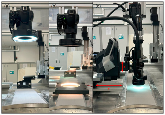 Qualitative and quantitative methods are used to analyze the powder bed of each applied layer. The qualitative assessment is carried out by taking images of an area of 120 × 130 mm2 (covering the whole diameter of the build platform) with a digital camera under different illumination scenarios. The camera used is a DSC-HX400V (Sony Corporation, Minato, Japan), which is integrated into the test rig with a removable fixture. A bright-field illumination is generated by a KR90 light ring (Kaiser Fototechnik GmbH & Co. KG, Buchen, Germany). A ring light developed in-house is used for images in the dark field. The quantitative analysis of the powder bed is realized by taking three-dimensional images with a digital microscope, which are then evaluated with regard to various surface parameters. For this purpose, a VHX 6000 digital microscope (Keyence Corporation, Osaka, Japan) is integrated into the test rig on a guiderail so that the microscope’s optics are positioned in the center of the build platform. Figure 4 shows the powder test rig with the integrated camera system, the different illumination setups, and the digital microscope aligned in the measuring position.