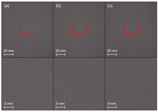 The quality of the powder bed was evaluated qualitatively using images. Figure 6 and Figure 7 show examples of powder layers that were applied at different recoater speeds and captured under different illumination conditions. In addition to the observation of the entire powder bed, magnified sections (marked in red) are shown.