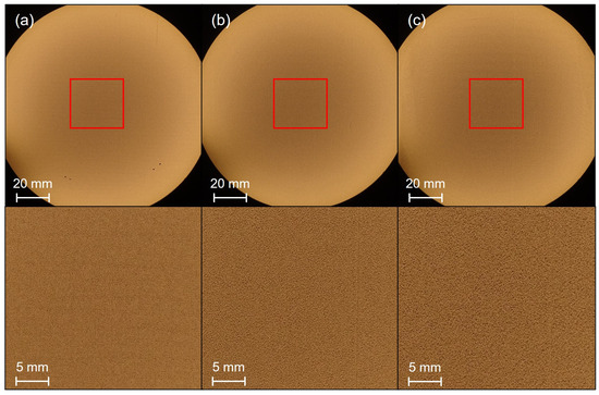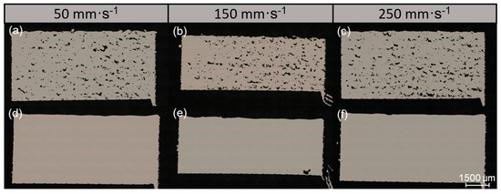 Cross-sectional images of samples produced at different recoater speeds using different process parameters: (a–c) 140 W laser power, 1400 mm⋅s−1 scanning speed; (d–f) 160 W laser power, 1400 mm⋅s−1 scanning speed.