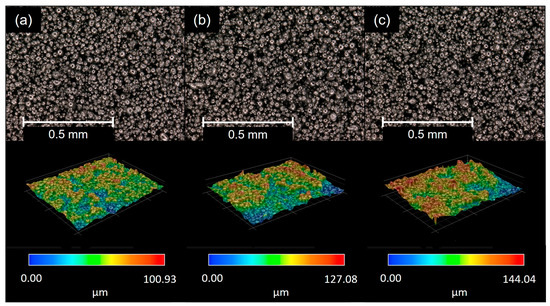 Due to the 300× magnification of the microscope, the image size is 1.166 × 0.874 mm2. The vertical measuring range (z-direction) is set to 300 µm in order to detect the highest and lowest points of the powder bed section with a high degree of certainty. The distance between the captured images is 5 µm. Based on these images, a 3-D surface profile of the powder bed was calculated using the principle of focus variation. From the measured topography, the surface parameters of arithmetic mean roughness (Sa) and maximum roughness depth (Sz) were determined using the Keyence software (Ver 3.2.0.121) provided with the VHX 6000 microscope. Information regarding filter operations is not provided by this software. In addition, the volume between the measured surface and the plane which passes through the highest point of the profile parallel to the averaged surface is determined. This surface parameter is called void volume (Vo) and was used by Mussatto et al. [18] to evaluate powder bed quality via ex situ measurements.