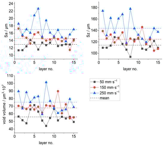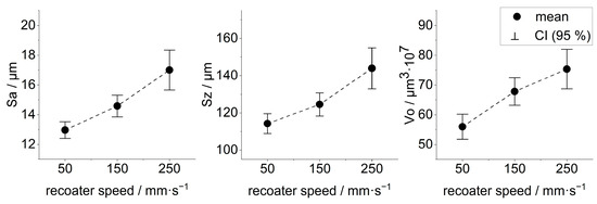 All three surface parameters of the powder layer (Sa, Sz, and Vo) show a clear dependence on recoater speed. The lowest roughness and the smallest void volume were achieved at a speed of 50 mm⋅s−1 and increase almost linearly with higher speed. The confidence intervals are widest at a recoater speed of 250 mm⋅s−1, which is due to the greater scatter of the measurements (see Figure 9). The greater scatter of the measurements at a recoater speed of 250 mm⋅s−1 indicates that the powder application is less uniform at this recoater speed than at the other two speeds tested. These results are consistent with the experimental investigations of Sehhat et al., who also determined an increase in the roughness of the powder layer [24], and of Mussatto et al., who found in increase in void volume with higher recoater speeds [18]. This shows that the test rig and the measurement method used are capable of quantifying the effects described in the literature [10,16,19,20,21].
