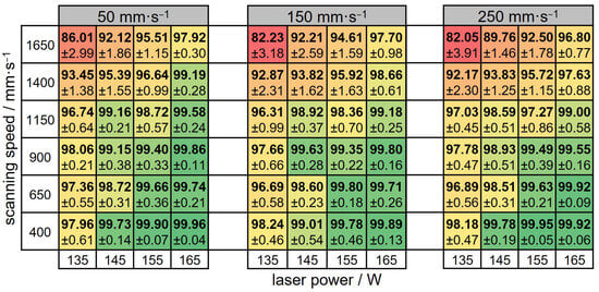 A similar influence of the process parameters of laser power and scanning speed on sample density is observed for the three build processes performed, with higher laser powers and lower scanning speeds being beneficial for achieving high relative part densities. The relative densities with standard deviations of the samples manufactured using three different recoater speeds (50 mm⋅s−1, 150 mm⋅s−1, and 250 mm⋅s−1) are shown in Figure 11 as a function of the process parameters used in the heat maps. The color coding (red = low relative sample density; green = high relative sample density) is consistent for the three heat maps.