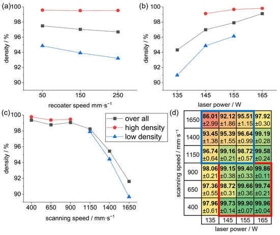Effect diagrams of the factors of (a) recoater speed, (b) laser power, and (c) scanning speed. (d) Heat map of build process using a recoater speed of 50 mm⋅s−1, with region for high-density samples (red) and region for low-density samples (blue).