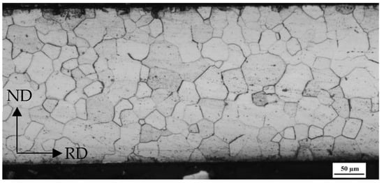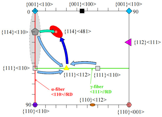 - The cold-rolled plate is composed of fibrous tissue and a shear band of 22°~36° with the rolling direction. The texture of the cold-rolled sheet is typically sharp α-fiber.