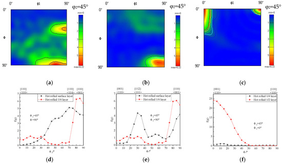 - The hot-rolled plate of the experimental steel displays a gradient both in the microstructure and texture in the thickness direction. The surface layer is composed of recrystallized grains, the center layer is elongated fibrous tissue, and the quarter of thickness layer is a mixed structure. The main texture from the surface to the center layer is as follows: ({112}<111> copper texture + {110}<114> brass texture) → {441}<014> → {001}~{111}<110>.