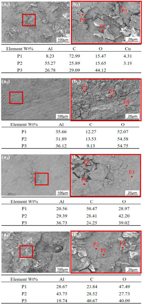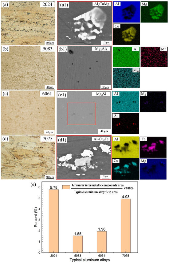 Microstructure characteristics of 2024 (a,a1), 5083 (b,b1), 6061 (c,c1), and 7075 (d,d1) aluminum alloys, as well as the fraction of the granular intermetallic compounds of a typical aluminum alloy field area (e). The red boxes are the EDS test area.