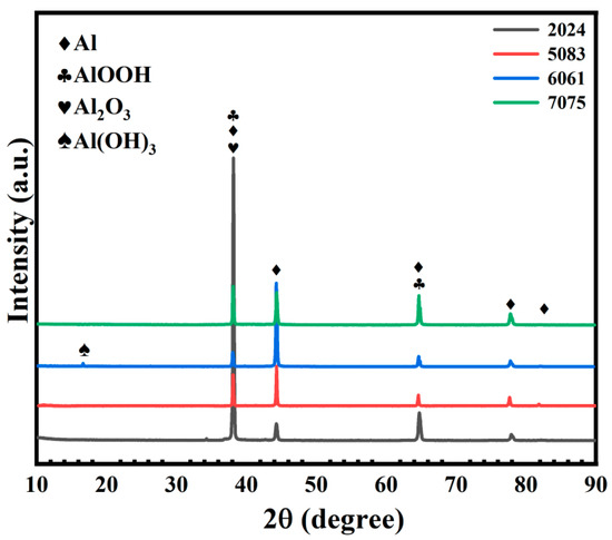 XRD spectra of 2024, 5083, 6061, and 7075 aluminum alloys exposed to Antarctic atmospheric environment.