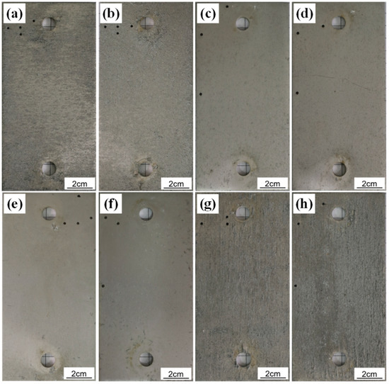 Figure 8 shows the surface morphologies of 2024, 5083, 6061 and 7075 aluminum alloys after removal of corrosion products in the atmospheric environment at Zhongshan Station for 12 months. The pits on the 2024 aluminum alloy sample surface are significantly deep and connect. Slight corrosion is observed in the area around the pits. The 5083 aluminum alloy sample surface shows a small diameter and dense pits, but the pits are not connected with each other. The 6061 aluminum alloy sample surface also shows pits, but the density of the pits is small and the sample surface has become uneven. Compared with the above aluminum alloys, corrosion of the 7075 aluminum alloy is the most serious, showing the largest values of pit depth and diameter. Pits with diameters of hundreds of microns can be observed on the sample surface. The exfoliation corrosion phenomenon is obvious, and the stepped layer morphology appears. For the aluminum alloys, the wet–dry cycle effect promotes the growth of the metastable pits, so many small pits can be observed. The characteristic of exfoliation corrosion is that the expansion of corrosion products in the intergranular corrosion leads to the delamination of the aluminum alloy surface and subsurface (Figure 8g,h).