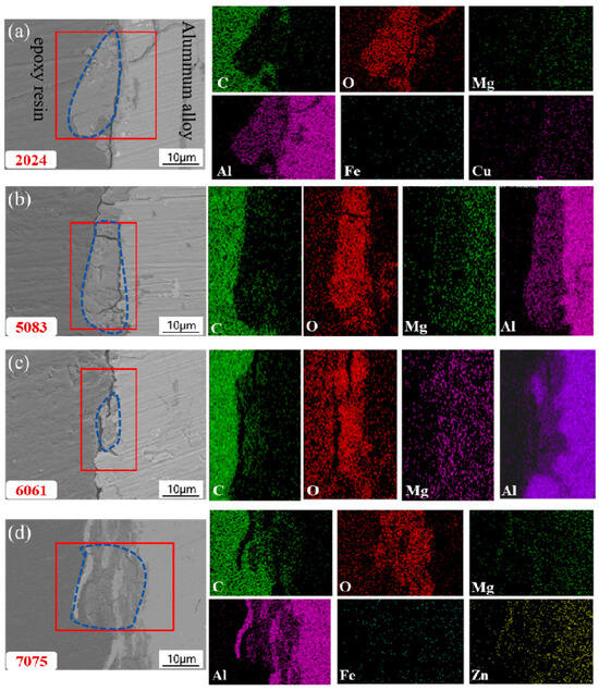 The cross-sectional morphologies and EDS mapping results of 2024 (a), 5083 (b), 6061 (c), and 7075 (d) aluminum alloys after one year of exposure to the Antarctic atmospheric environment. The light-gray sections represent the substrate, while the areas marked with blue dashed lines indicate the corrosion products.