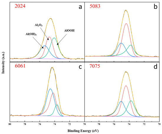Figure 7 shows the XPS fitting results of surface corrosion products of four kinds of aluminum alloys exposed to the atmospheric environment at Zhongshan Station in Antarctica. The binding energy of Al 2p peaks at 74.7 eV, 74.2 eV, and 73.8 eV represent Al(OH)3, Al2O3, and AlOOH respectively. XPS results show that the corrosion products of these four kinds of aluminum alloys are composed of AlOOH, Al2O3 and Al(OH)3, where the area of the peak represents its relative content in the corrosion products [18]. The highest content of corrosion products of 2024, 5083 and 7075 aluminum alloys is Al2O3, while that of the 6061 aluminum alloy is Al(OH)3. The formation of alumina reduces the activity of the surface of aluminum alloys, and its inertness enables the oxidation layer to improve the corrosion resistance of aluminum alloys [19]. Al(OH)3 can also be attached to the aluminum alloys surface to resist the attack of oxygen, moisture, and other corrosive media in the atmospheric environment, and improve the stability of aluminum alloys in corrosive environments.