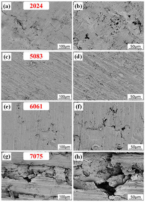 Surface morphologies of 2024 (a,b), 5083 (c,d), 6061 (e,f), and 7075 (g,h) aluminum alloys after removing corrosion products.