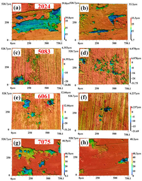 3D corrosion morphologies of 2024 (a,b), 5083 (c,d), 6061 (e,f), and 7075 (g,h) aluminum alloys after removing corrosion products.
