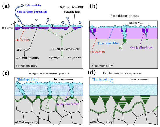 Schematic illustration of corrosion process of aluminum alloy in Antarctic environment (a), pit initiation process (b), intergranular corrosion process (c), exfoliation corrosion process (d).