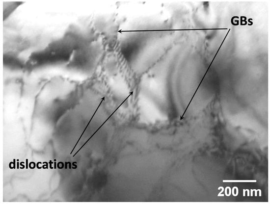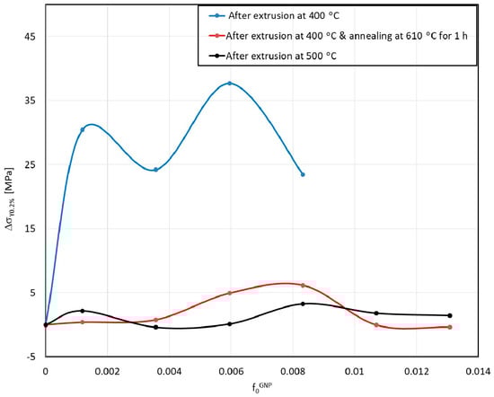 | Series #3 | Compaction and holding of the compact at 370 °C for 1200 s. Holding in the mold for 270 s and extrusion at 400 °C. Air cooling, and annealing at 610 °C for 1800 s. | The ΔσY − shows only one peak at, = 0.008/85 MPa. The well-distinguished first peak in Series #1 has practically disappeared. | Well-distinguished HP strengthening. YS increased to ~79 MPa. Expected OBM and/or OSM strengthening, superimposed upon that of HP. The reinforcement’s net contribution to the YS strength is shown in Table 2 and Figure 12. |