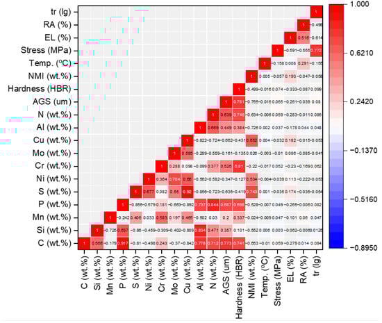 Pearson’s correlation coefficient was utilized to evaluate the relationship between input and output variables. The coefficient values range from −1 to +1, and these are visually represented in a heatmap, as shown in Figure 1. For better visualization, the color intensity corresponds to the magnitude of the linear relationships between the variables. A higher color intensity indicates a stronger relationship, with the strongest relationships, such as a variable’s correlation with itself, represented in red and having the maximum value of +1. Furthermore, relatively strong positive relationships, such as that of carbon (C) with phosphorus (P), aluminum (Al), nitrogen (N), austenite grain size, and hardness (HRB), are depicted in shades of red. However, the intensity is slightly lower as these coefficients are positive but less than +1, typically exceeding 0.5. From a metallurgical perspective, carbon enhances the hardness of steel by forming carbide precipitates and strengthening the ferrite matrix through solid solution strengthening. Additionally, higher carbon content facilitates martensite formation during quenching, further increasing hardness []. This direct positive effect on hardness (HRB) is also reflected in the heat map, with a correlation coefficient of 0.772. Conversely, the negative correlation of C (wt.%) with temperature is evident, aligning with the known phenomenon that higher temperatures adversely affect the strength imparted by carbon in steels. To aid in precise interpretation, the actual correlation coefficient values are displayed within each heatmap cell, providing a clearer understanding of the dependency between variables.