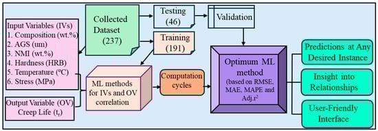 These ML methods were first trained using a training dataset and then tested using a testing dataset. A schematic representation of the workflow for predicting the creep life of 5Cr-0.5Mo steels is illustrated in Figure 2.