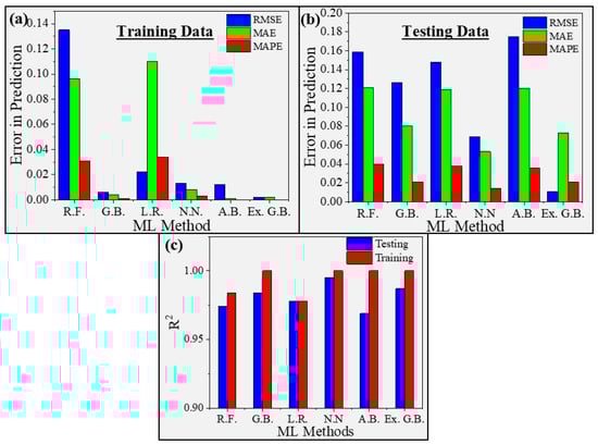 Graphical representation of the performance evaluation of various machine learning methods, (a) for training data (b) for testing data. (c) R2 for testing and training data. The smaller values of RMSE, MAE, and MAPE represent higher accuracy. The higher values~1 for R2 represent better predictability.