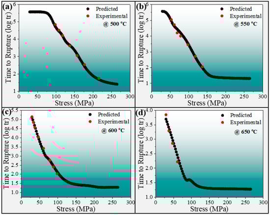 Graphical representation of the effect of applied stress on the creep rupture life of 5Cr-0.5Mo steel: (a) at 500 °C, (b) at 550 °C, (c) at 600 °C, (d) at 650 °C. The red color is for experimental, and the black color is for prediction from ANN model.