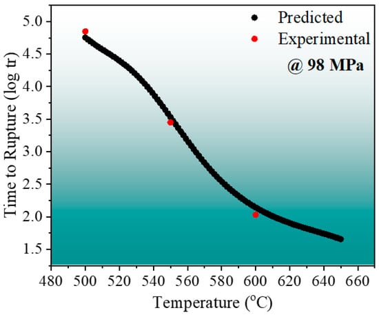 Graphical representation of the effect of temperature on the creep rupture life under a stress of 98 MPa. The red color is for experimental, and the black color is for prediction from ANN model.