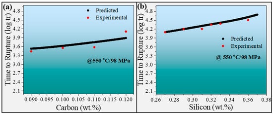 Graphical representation of the effect of: (a) carbon content, (b) silicon content on the creep rupture life at 550 °C and under a stress of 98 MPa. The red color is for experimental, and the black color is for prediction from ANN model.
