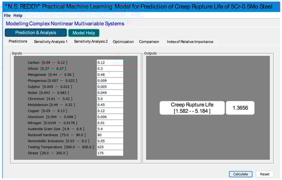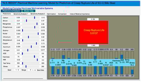Figure 8 presents the graphical user interface (GUI) of the developed ANN model, designed to predict creep rupture life based on 16 input variables. The GUI enables users to input infinite parameter combinations for precise predictions and dynamically visualize output variations as inputs are modified. It allows for analyzing the impact of individual variables by varying one while keeping others constant and evaluating the combined effect of two variables to gain deeper insights. Additionally, users can optimize specific parameters to achieve target creep rupture life, assess the relative importance of each variable, and compare predictions across multiple input configurations for a comprehensive evaluation of material compositions and operating conditions.