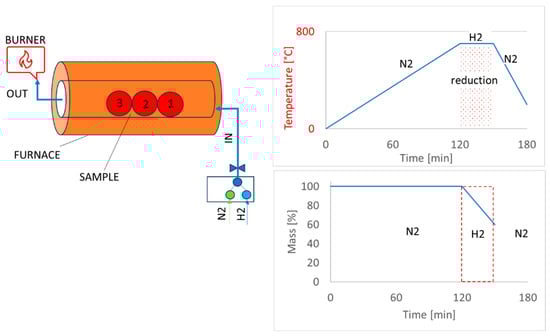 The reduction tests of pellet samples were conducted using modified equipment as shown in Figure 1. For the 100% hydrogen reduction, a sample of three pellets was used for each pellet type. The reduction temperatures were set at 600 °C, and an experiment with one type of pellet B was also carried out at a higher temperature (800 °C) to verify the effect of temperature on the reduction process. The temperature was set to 600 °C because the aim of this research was to contribute to the determination of the reaction mechanism at lower temperatures.