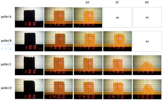 High-temperature observation of iron pellet samples. DT = deformation temperature (°C); ST = shrinkage temperature (°C); HT = hemisphere temperature or melting point (°C); NA—not analyzed at higher temperatures due to the temperature limit being reached, with a maximum of about 1515 °C.